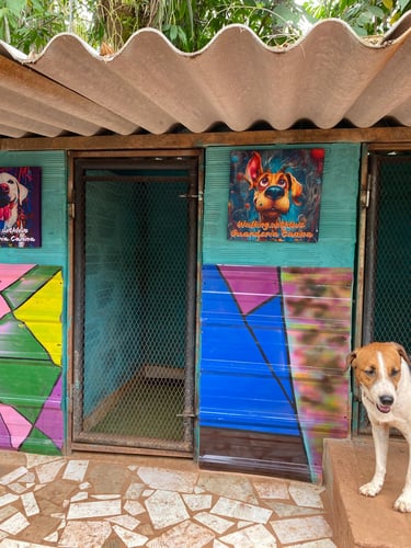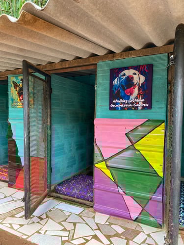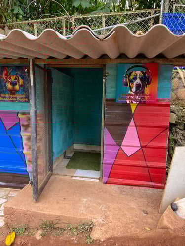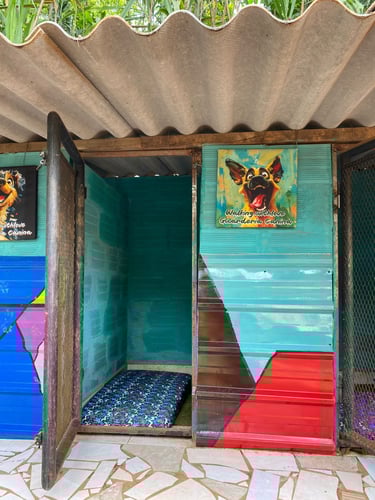 Cada cabaña es un hogar único con murales artísticos, camas cómodas y colores vivos para que tu peludo se sienta en su espacio personal.